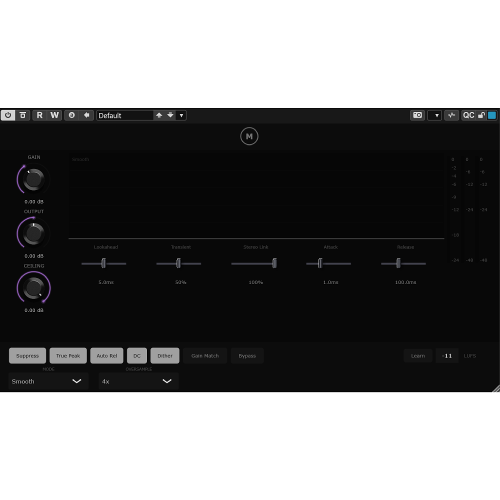 Key Features: Parabolic gain scheduling • True-peak detection with fixed latency • Auto-release with adaptive speed • Low-frequency pumping mitigation • Input/output metering with gain reduction display • Ceiling control