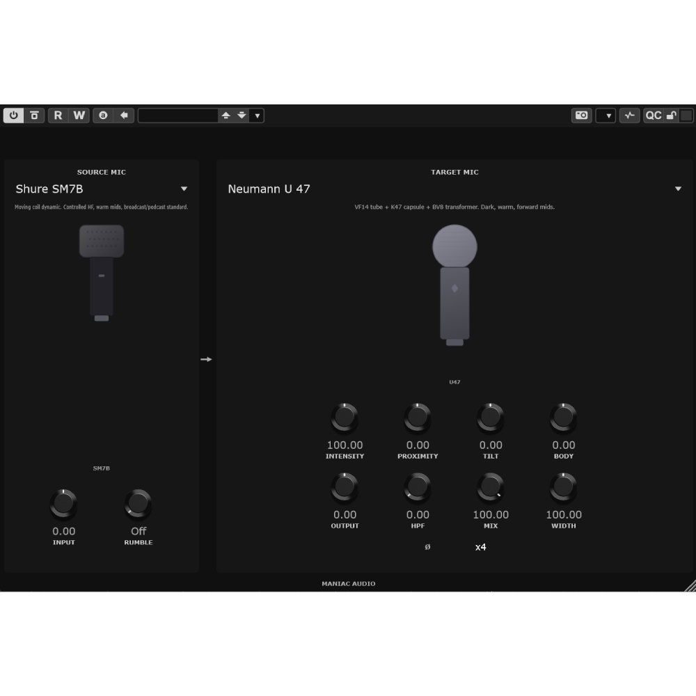 Key Features: 83 microphone models (condensers, dynamics, ribbons) • Neumann, AKG, Shure, Royer, Bock Audio and more • Frequency response matching from real datasheets • Proximity effect control • Character/coloration amount • Source mic selection