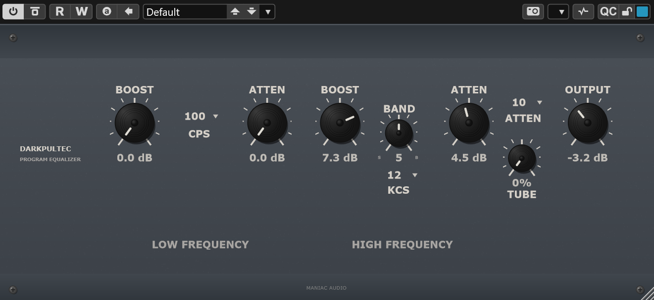 DarkPultec is a vintage-inspired EQ that captures the smooth, musical character of classic passive equalizers. Designed for warmth and clarity, it lets you boost and attenuate frequencies simultaneously to achieve rich low-end weight, silky highs, and a naturally balanced tone. Perfect for drums, vocals, bass, and mastering, DarkPultec delivers effortless analog color with a modern, dark interface.